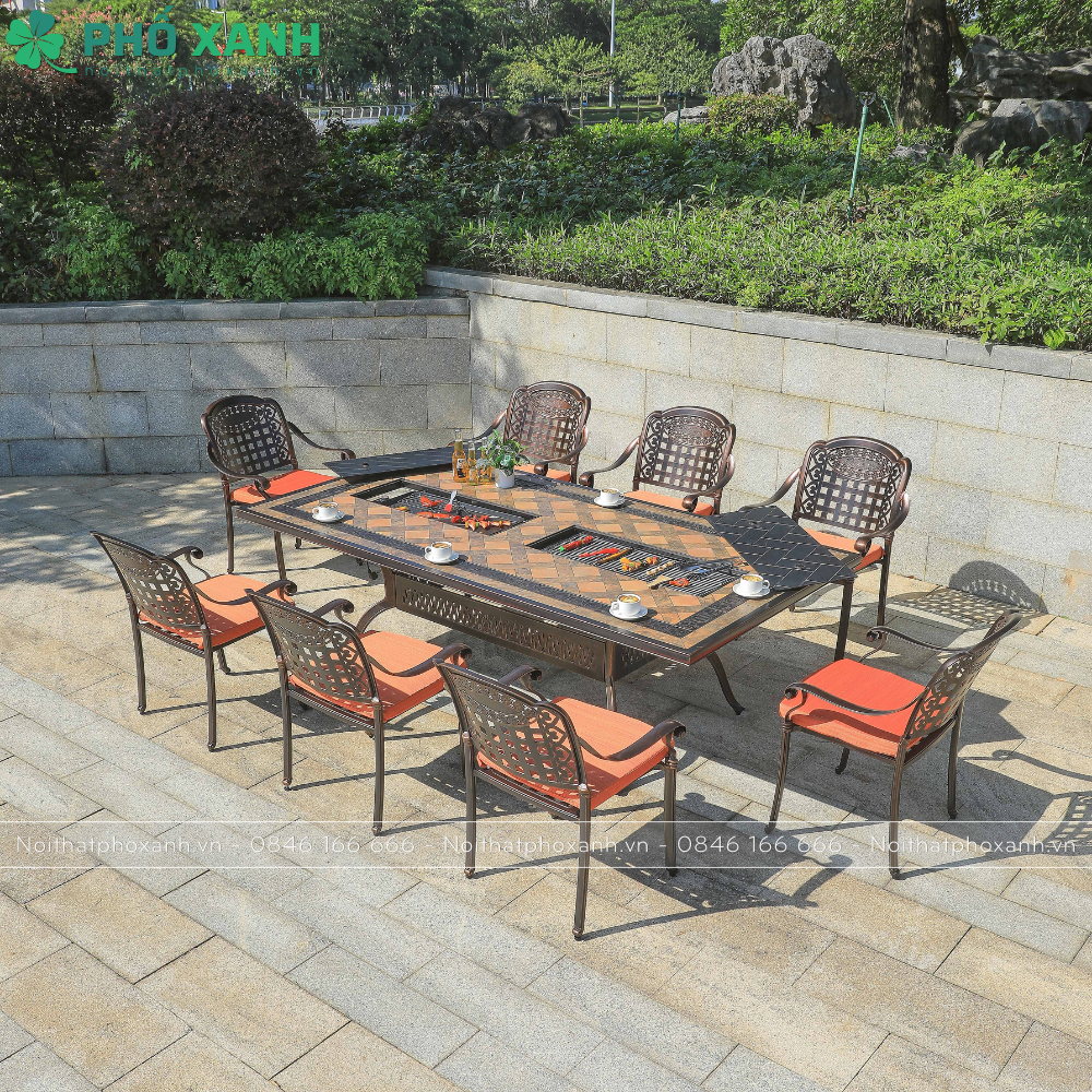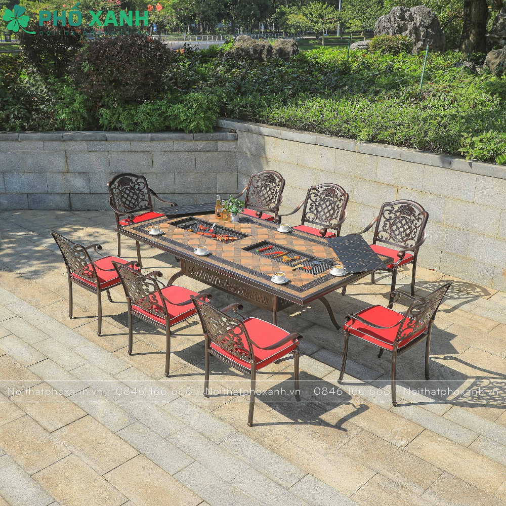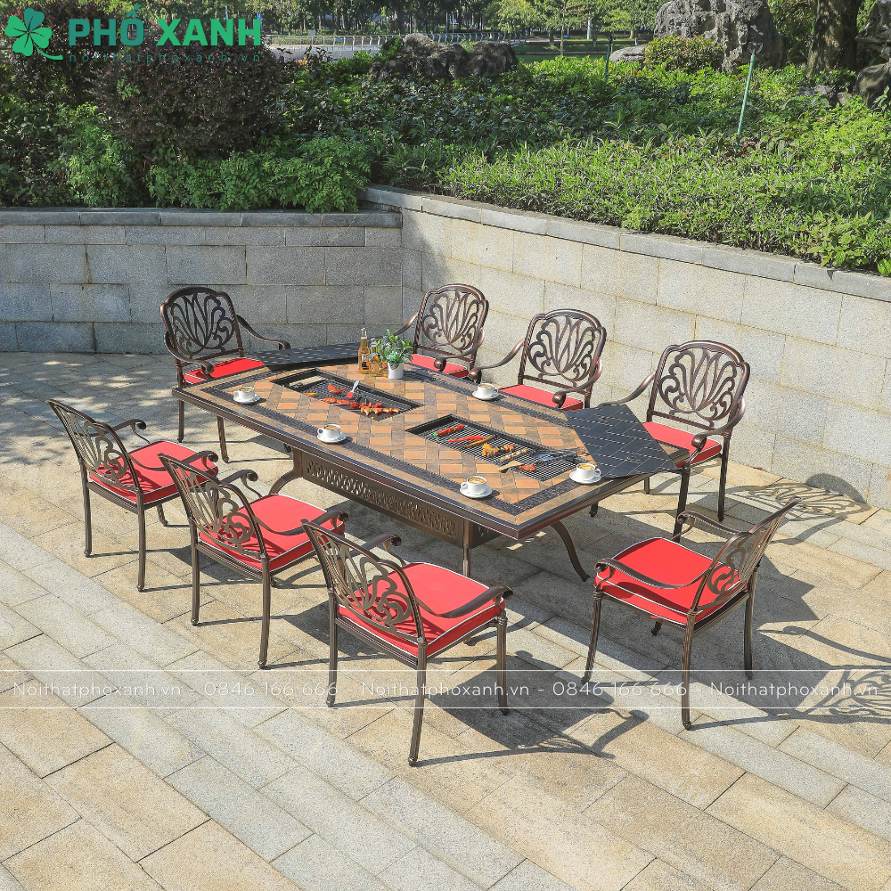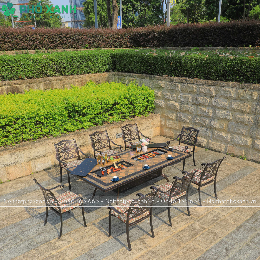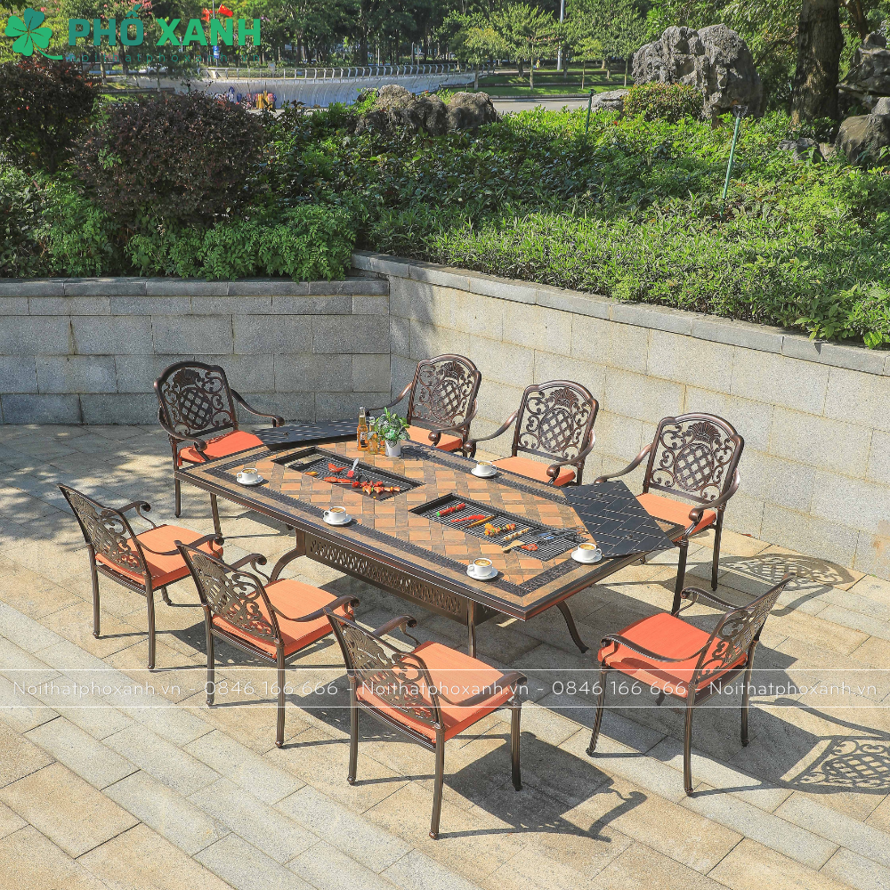 Không chỉ là một sản phẩm nội thất ngoại thất tiện ích, bàn nhôm đúc mặt đá kết hợp nướng đôi còn là điểm nhấn làm đẹp cho không gian sân vườn. Thiết kế tinh tế kết hợp với chất liệu cao cấp, sản phẩm này không chỉ giúp tạo điểm nhấn cho không gian mà còn tôn lên vẻ đẹp tự nhiên xung quanh.