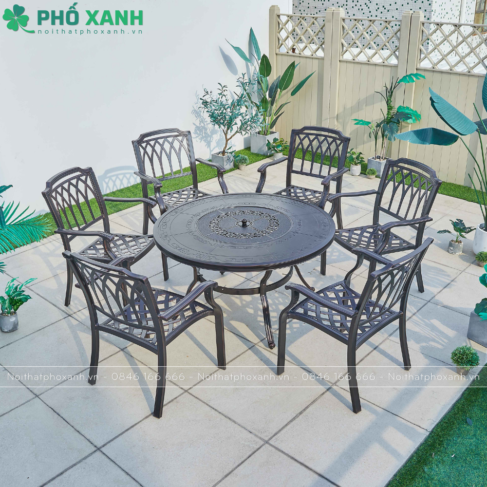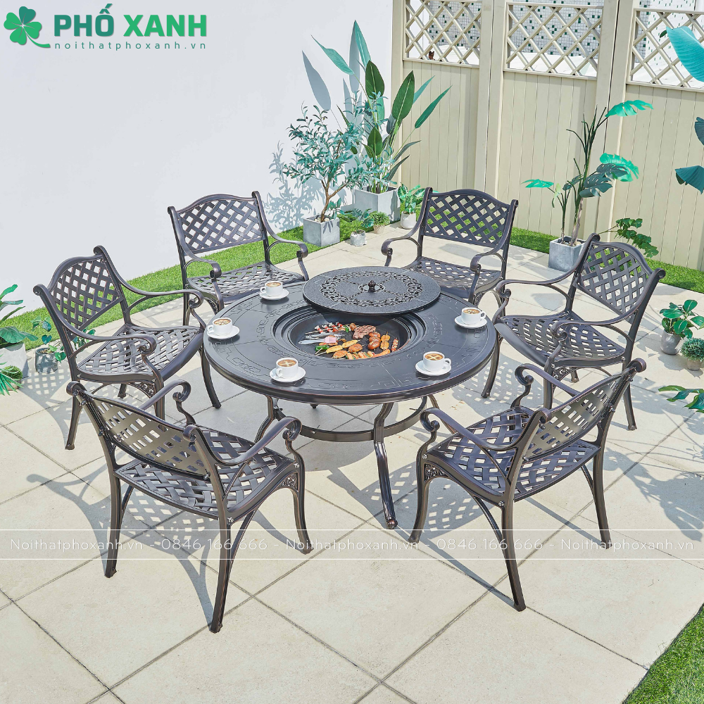 Bàn được làm từ nhôm đúc chắc chắn, có độ bền cao và khả năng chống oxy hóa tốt, giúp sản phẩm luôn giữ được vẻ đẹp và sự sang trọng qua thời gian sử dụng. Mặt bàn tròn rộng rãi cung cấp không gian đủ cho các loại thực phẩm và đồ uống, cùng với hệ thống lưới nướng BBQ hiện đại, giúp bạn dễ dàng chế biến các món ăn ngon mà không cần phải lo lắng về việc sử dụng lửa than.