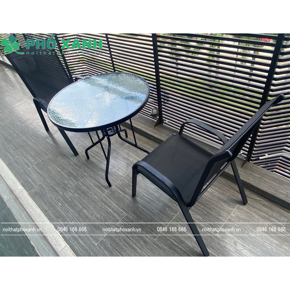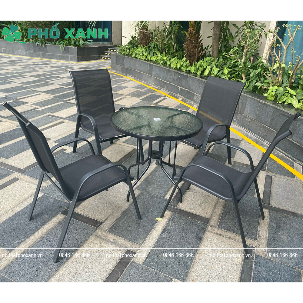 Chất liệu chính của bộ bàn ghế này là khung thép kết hợp với lưới Textilene, tạo nên sự bền bỉ và dễ dàng vệ sinh. Màu sắc chủ đạo của sản phẩm là màu đen, tạo điểm nhấn sang trọng và tinh tế cho không gian sân vườn của bạn.