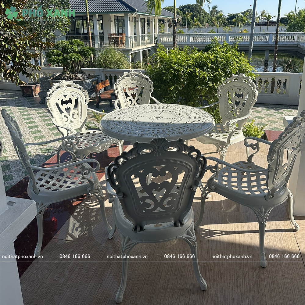 Chất liệu hợp kim nhôm đúc là vật liệu được ưa chuộng trong sản xuất bàn ghế ngoại thất nhờ vào đặc tính nhẹ, chống oxy hóa và không bị ảnh hưởng bởi tác động của thời tiết. Sơn tĩnh điện giúp cho sản phẩm có độ bền cao và màu sắc sáng bóng, không phai màu theo thời gian.
