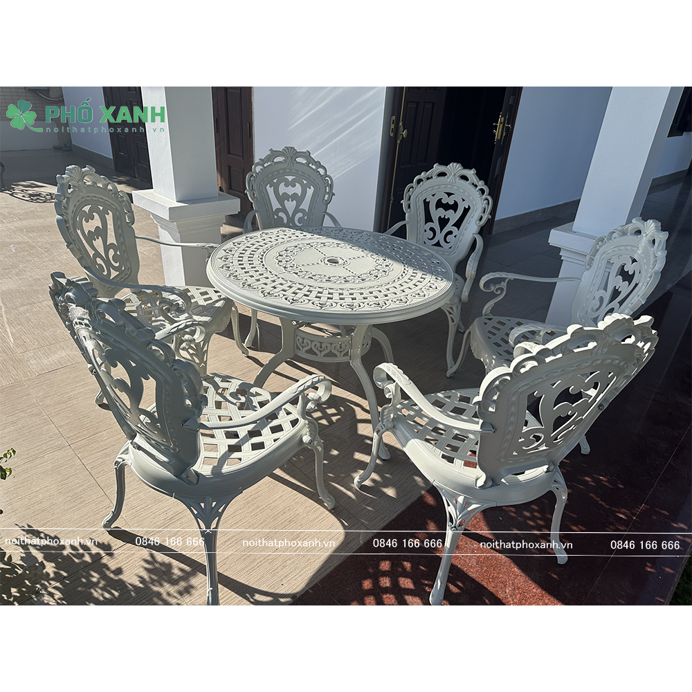 Bộ bàn ghế hợp kim nhôm đúc màu trắng 6 ghế với chất liệu hợp kim nhôm đúc cao cấp và sơn tĩnh điện, sản phẩm không chỉ đảm bảo độ bền cao mà còn mang lại vẻ đẹp sang trọng và hiện đại cho không gian ngoại thất của bạn.