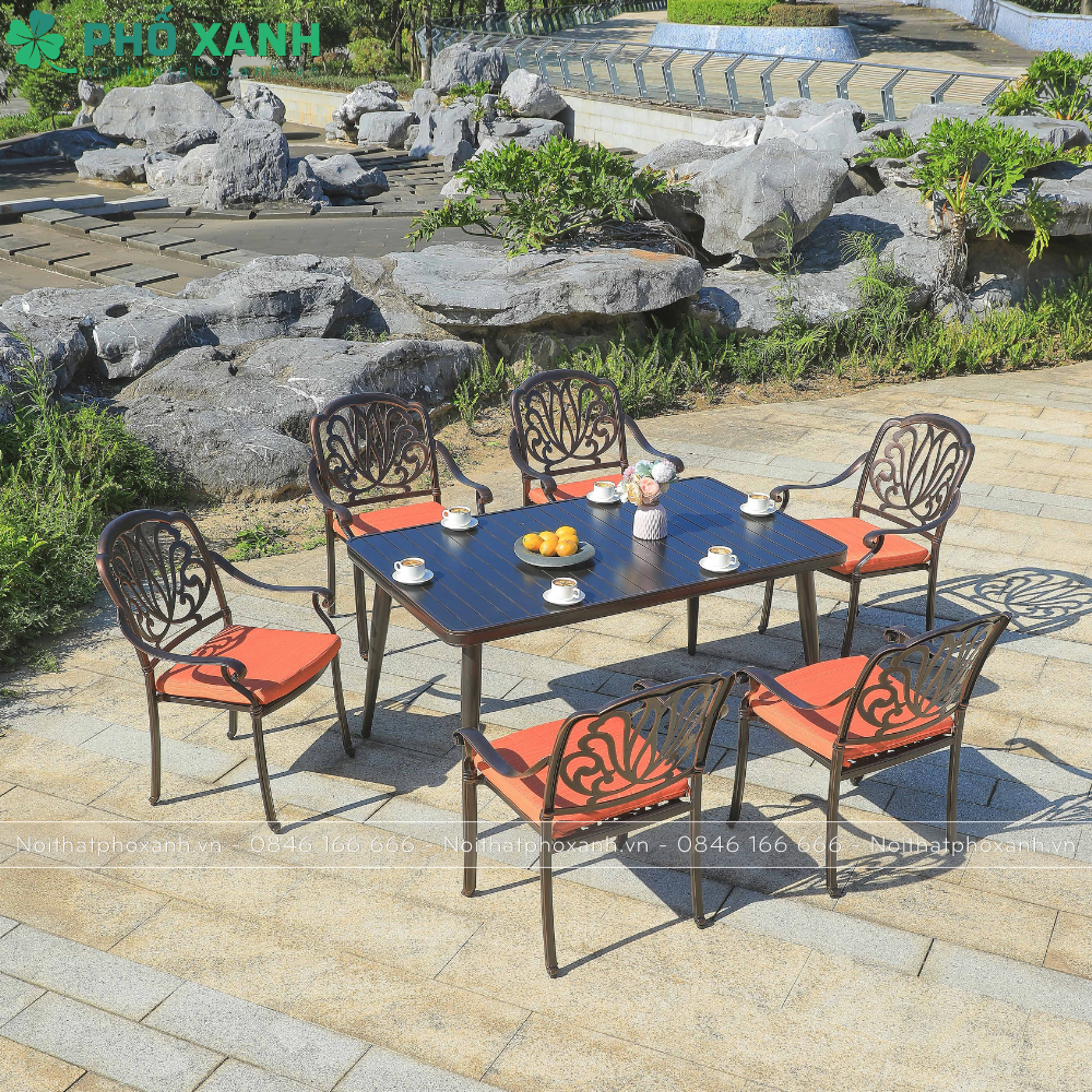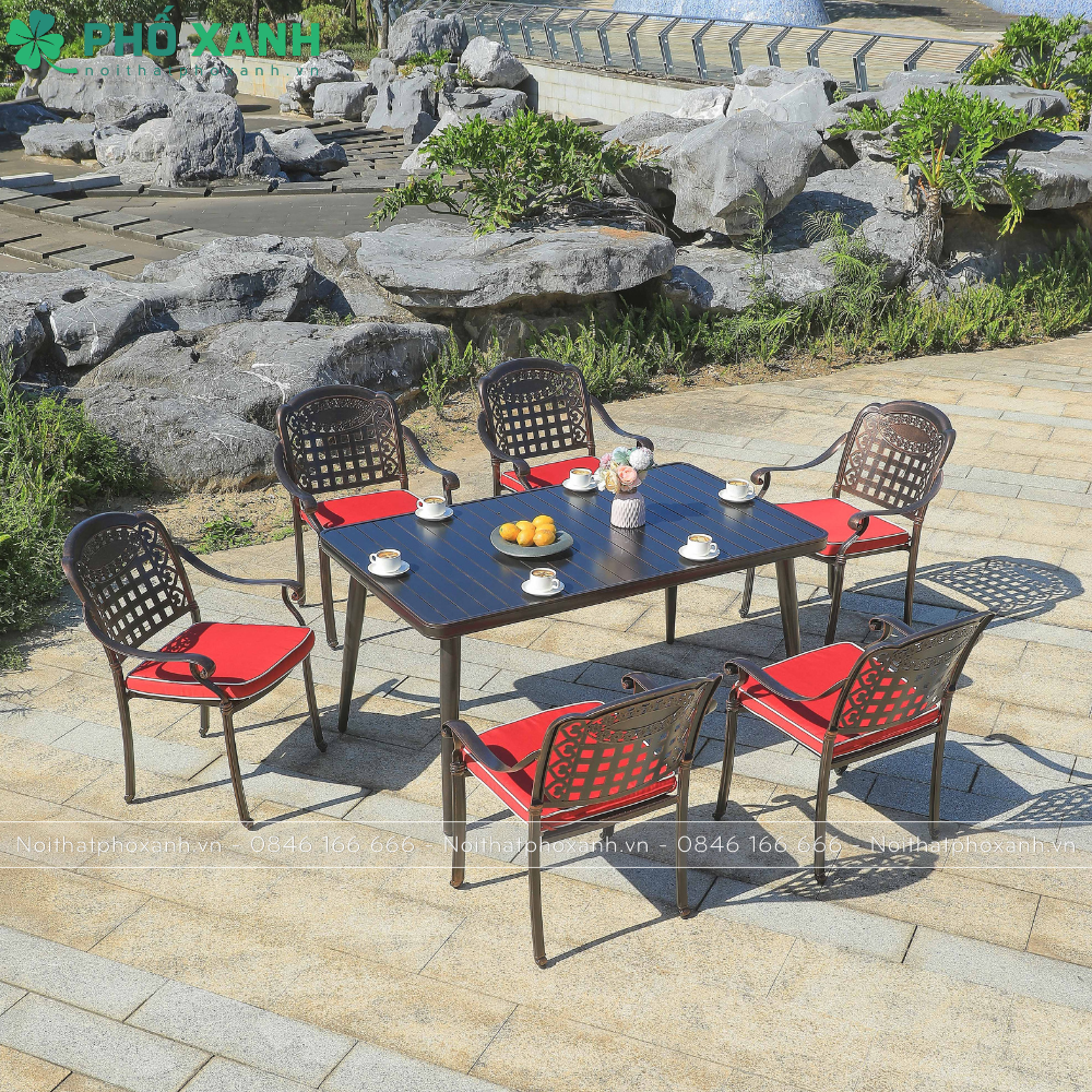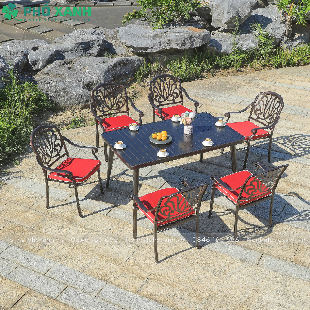 Bộ bàn ghế ngoài trời nan nhôm đúc 6 ghế BND-NN15090D được thiết kế để sử dụng trong không gian ngoại thất như sân vườn, ban công, hồ bơi, quán cafe, nhà hàng, khu vực công viên, resort, biệt thự, v.v. Sản phẩm không chỉ mang lại sự thoải mái, tiện ích mà còn tạo điểm nhấn esthetic cho không gian sống của bạn.