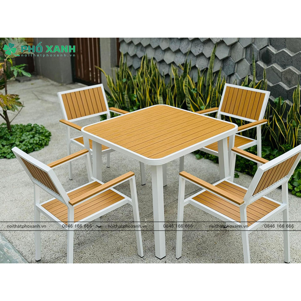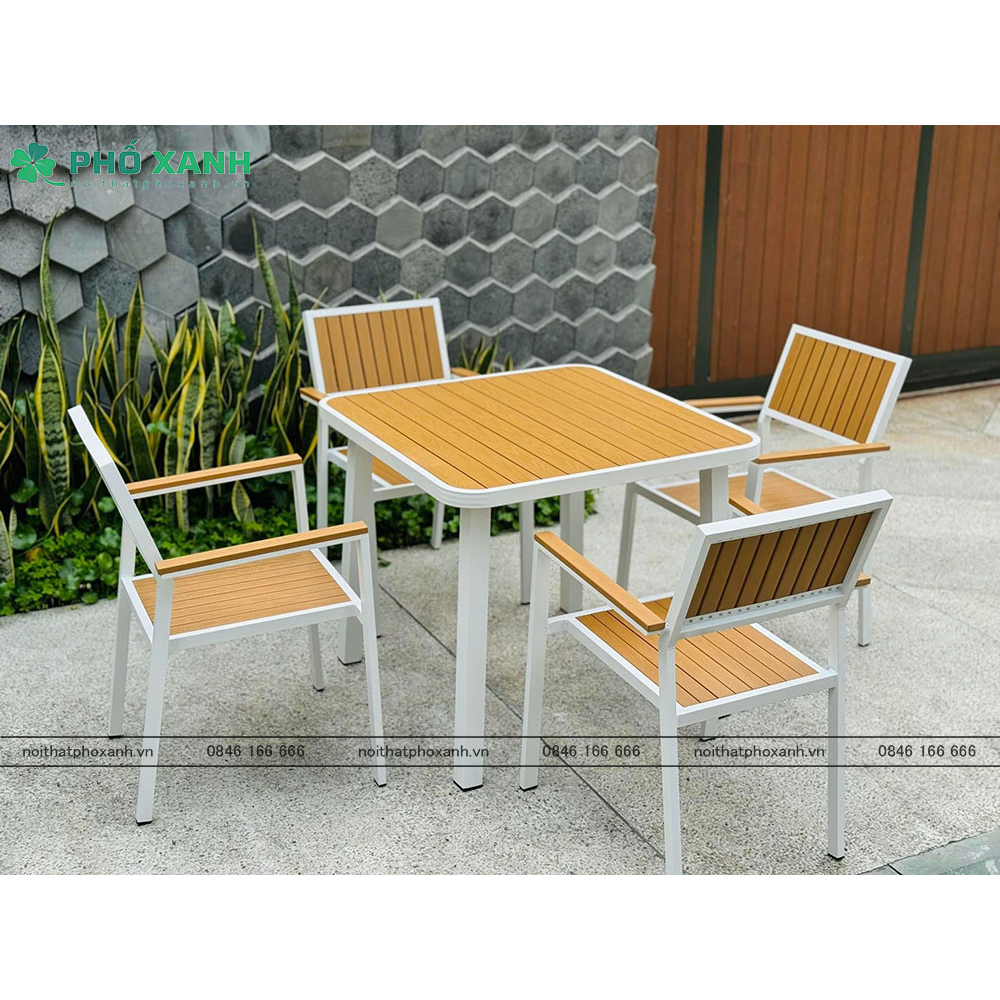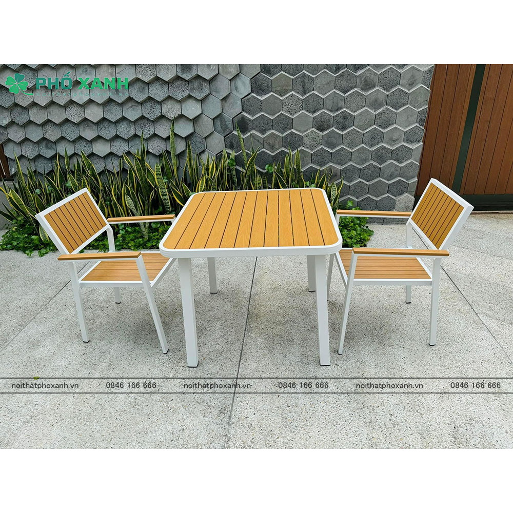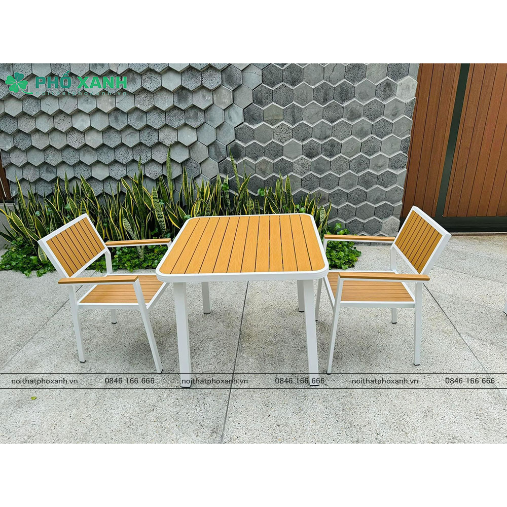 Chất liệu hợp kim nhôm đúc và sơn tĩnh điện kết hợp với Composite (Polywood) tạo nên sự bền bỉ và chắc chắn cho sản phẩm. Không chỉ có khả năng chống mài mòn, chịu nhiệt tốt, bộ bàn ghế còn dễ dàng vệ sinh và bảo quản. Màu sắc và kiểu dáng hiện đại của sản phẩm giúp tạo điểm nhấn cho không gian, đồng thời tạo cảm giác thoải mái cho người sử dụng.