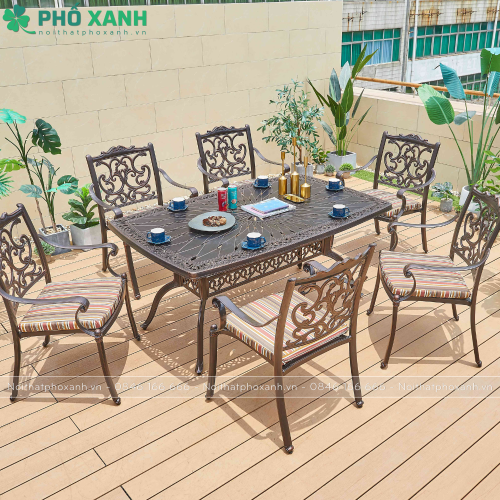 Vật liệu chính để sản xuất bộ bàn ghế nhôm đúc này là nhôm đúc cao cấp, đảm bảo tính chắc chắn, bền bỉ và không bị ảnh hưởng bởi thời tiết. Đặc biệt, nhôm đúc còn mang lại vẻ đẹp hiện đại và dễ dàng vệ sinh, bảo quản sau mỗi lần sử dụng. Bên cạnh đó, mặt bàn và ghế được thiết kế linh hoạt, tạo điểm nhấn cho không gian sân vườn và phòng ăn ngoài trời.