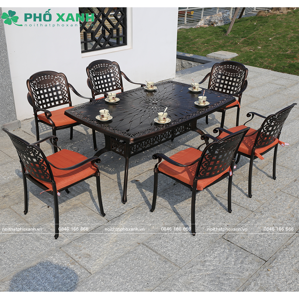 Bộ bàn ghế nhôm đúc biệt thự sân vườn hình chữ nhật 6 ghế BND-L1650105D là một sản phẩm chất lượng cao, được thiết kế đặc biệt hoàn toàn bằng hợp kim nhôm đúc, bề mặt được sơn tĩnh điện để phục vụ nhu cầu sử dụng tại không gian sân vườn, ngoài trời của các biệt thự hiện đại.