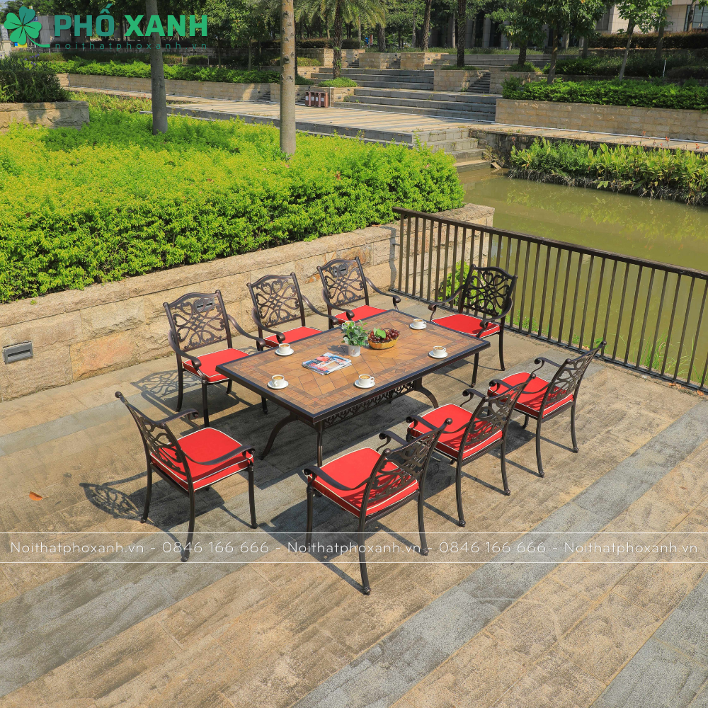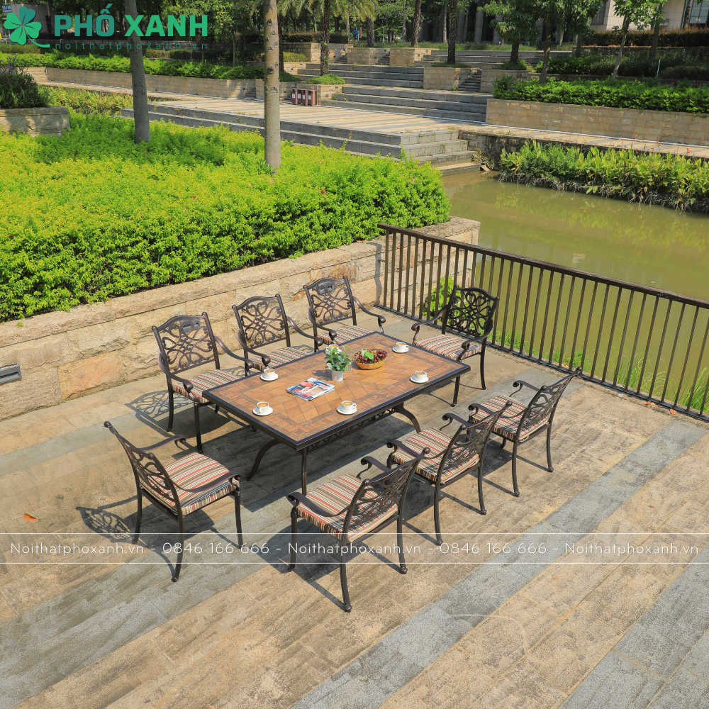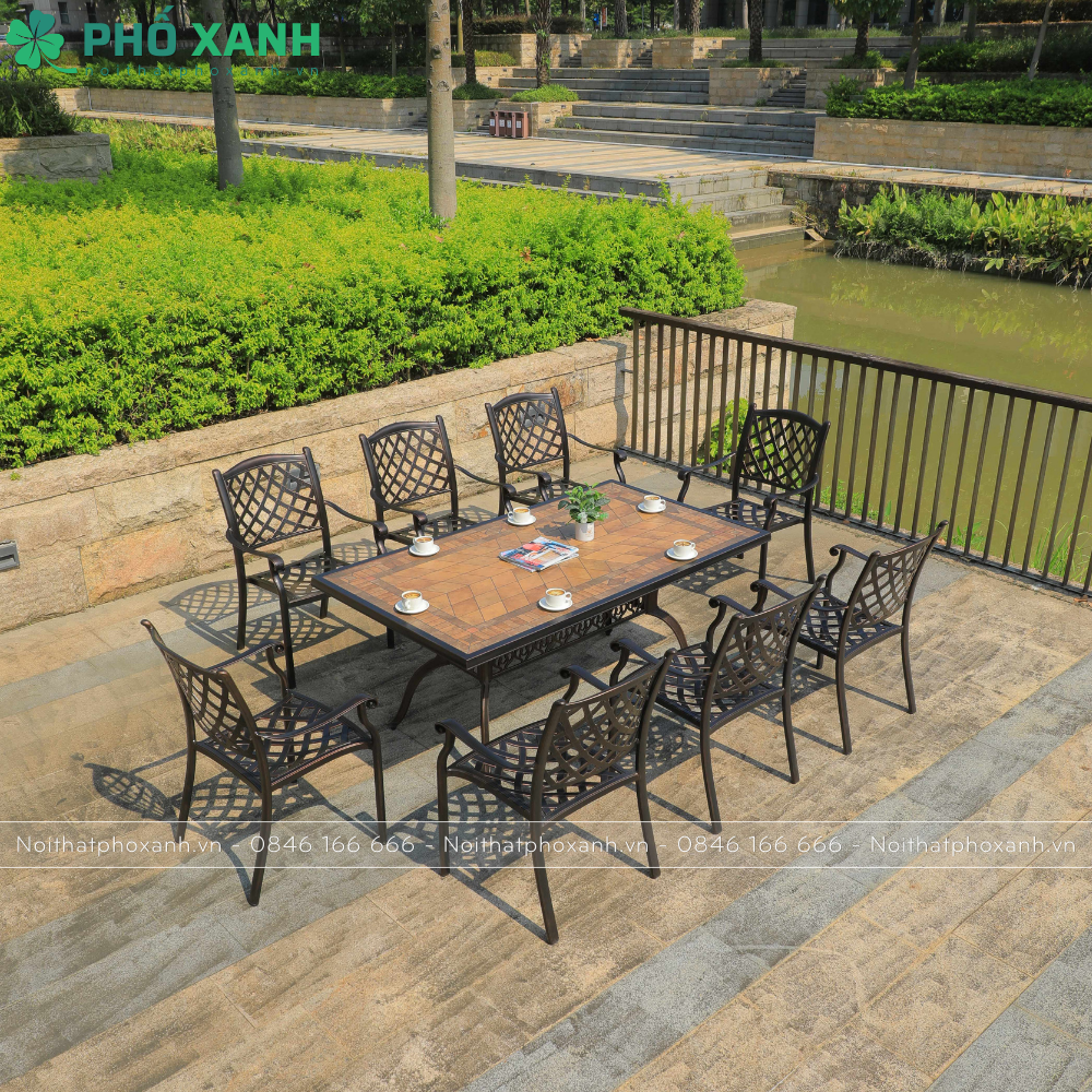 Với chất liệu nhôm đúc cao cấp, bộ bàn ghế này đảm bảo độ bền và độ ổn định cao, phù hợp với việc sử dụng ngoài trời trong thời gian dài mà không lo sự ảnh hưởng của thời tiết. Mặt đá 8 ghế nhập khẩu cũng đem lại vẻ đẹp tự nhiên và sự sang trọng cho bộ bàn ghế, tạo điểm nhấn cho không gian trang trí ngoại thất.