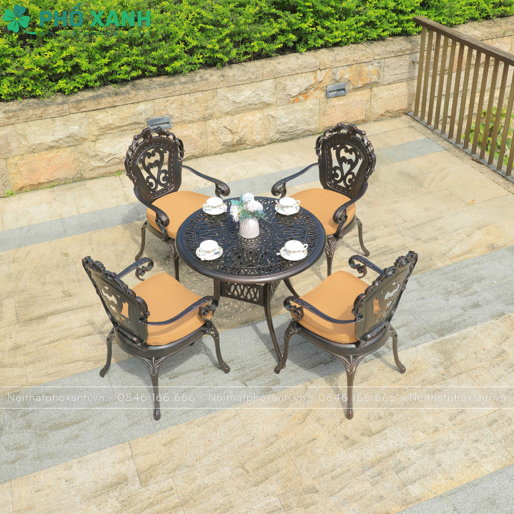 Với chất liệu nhôm đúc chắc chắn và bền bỉ, bộ bàn ghế này sẽ giúp bạn tận hưởng những buổi tiệc ngoài trời, dạo chơi cùng gia đình và bạn bè một cách thoải mái và tiện lợi.