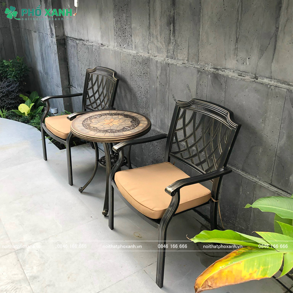 Nhôm đúc là một trong những chất liệu lý tưởng cho các sản phẩm ngoài trời. Đặc điểm nổi bật của nhôm là khả năng chống oxy hóa và ăn mòn, điều này giúp bộ bàn ghế có thể bền bỉ trước mọi điều kiện thời tiết.