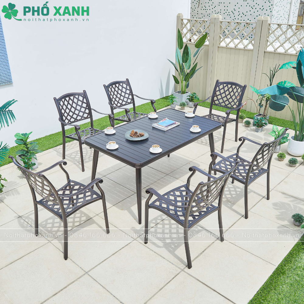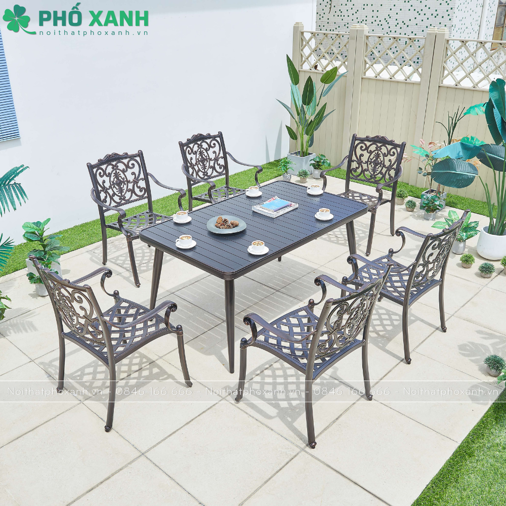 Bộ bàn ghế nhôm đúc sân vườn biệt thự nan nhôm đúc 6 ghế BND-NN15090VD, một sản phẩm chất lượng cao từ Nội Thất Phố Xanh. Được làm từ hợp kim nhôm sơn tĩnh điện, bộ bàn ghế này sẽ là sự lựa chọn hoàn hảo cho không gian sân vườn của bạn.