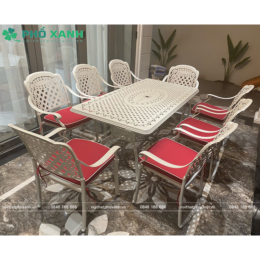 Bộ bàn ghế nhôm đúc sân vườn hình chữ nhật BND-17090TK có thể kê từ 6 đến 8 ghế. Đây là một lựa chọn tuyệt vời cho không gian sân vườn của bạn. Bộ bàn ghế này được làm từ hợp kim nhôm đúc chất lượng cao sơn tĩnh điện hoàn toàn, giúp chống lại thời tiết và đảm bảo độ bền lâu dài.