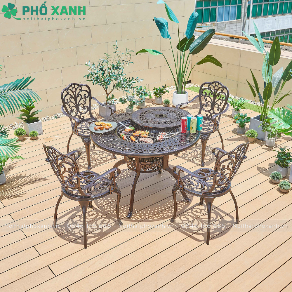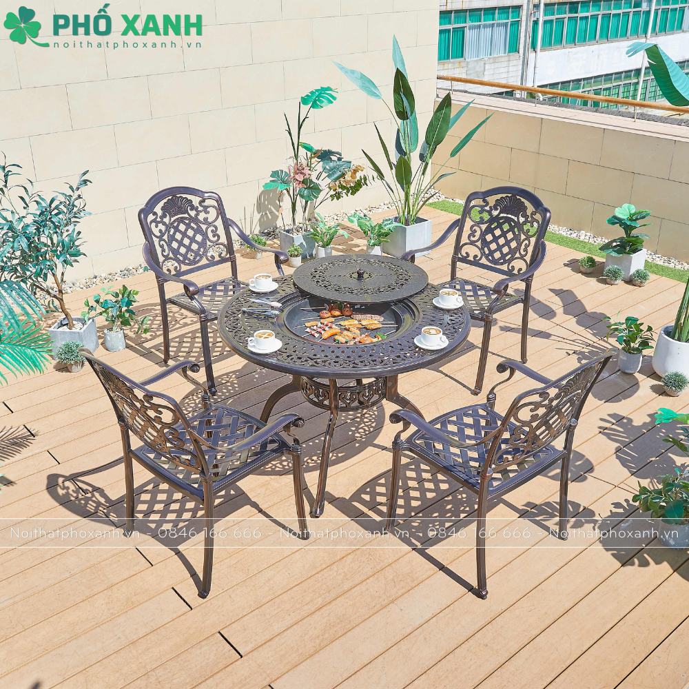Ngoài ra, việc kết hợp nướng BBQ cùng bộ bàn ghế nhôm đúc tròn giúp tạo ra không gian ấm cúng và thân thiện, thích hợp cho việc tổ chức các buổi tiệc ngoại trời cùng gia đình và bạn bè. Sản phẩm được thiết kế với đường nét tinh tế và hiện đại, phản ánh sự sang trọng và lịch lãm.