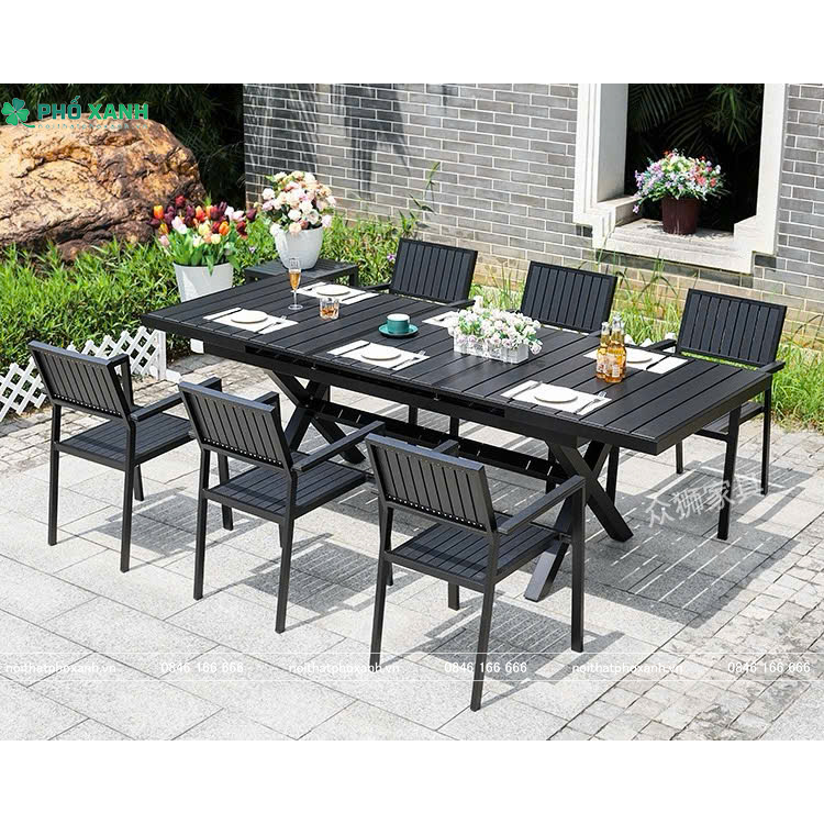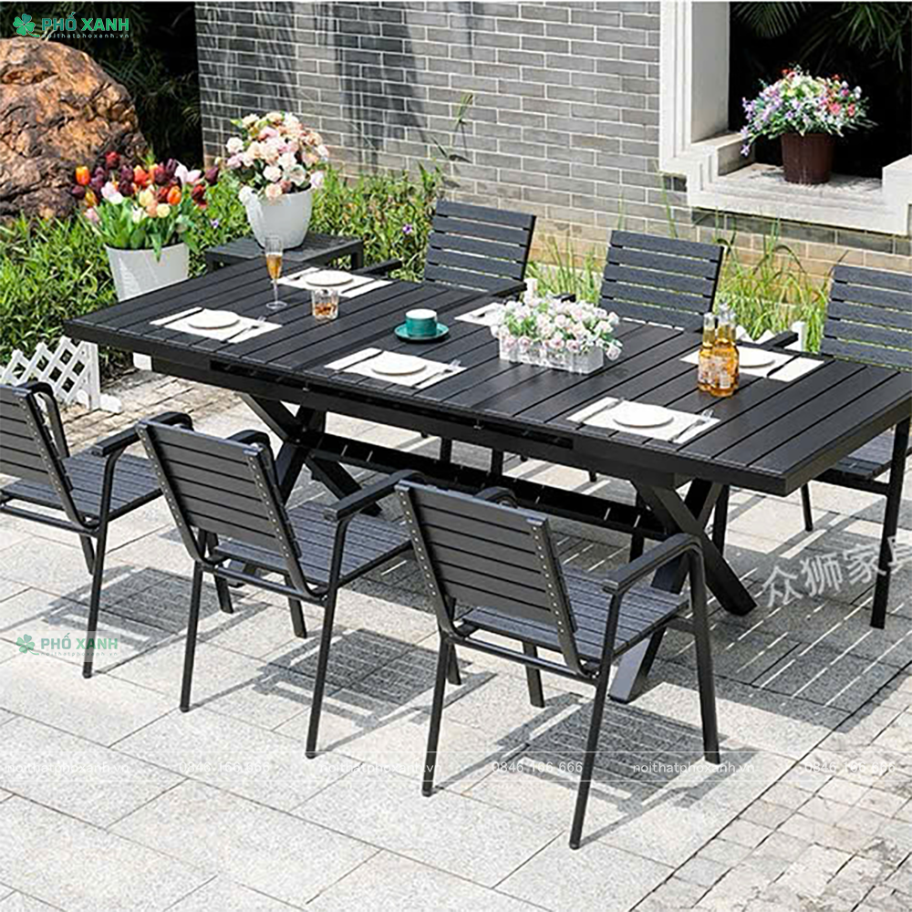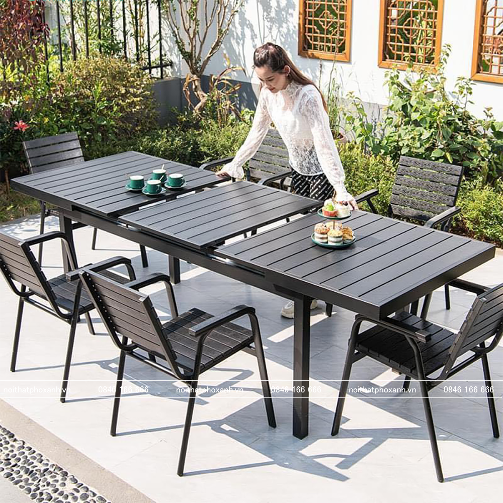 Bộ bàn ghế Composite (Polywood) thông minh thu gọn kéo dài được thiết kết với chất liệu khung hợp kim nhôm đúc sơn tĩnh điện và nan Composite, sản phẩm đảm bảo chất lượng, độ bền và tính thẩm mỹ cao khi sử dụng cho không gian sân vườn, ngoài trời.