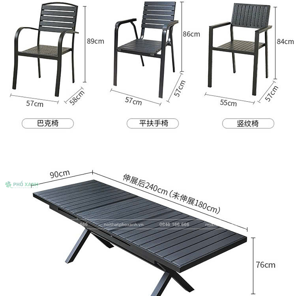 Với kích thước L180*W90*H75 cm khi thu gọn và L245*W90*H75 cm khi kéo dài, bộ bàn ghế này phục vụ tốt cho nhu cầu sử dụng trong không gian sân vườn, ban công, hoặc các khu vực ngoài trời khác. Quy cách bao gồm 1 bàn và 10 ghế, đáp ứng nhu cầu sử dụng cho các buổi tiệc ngoài trời, họp mặt gia đình hoặc bạn bè.