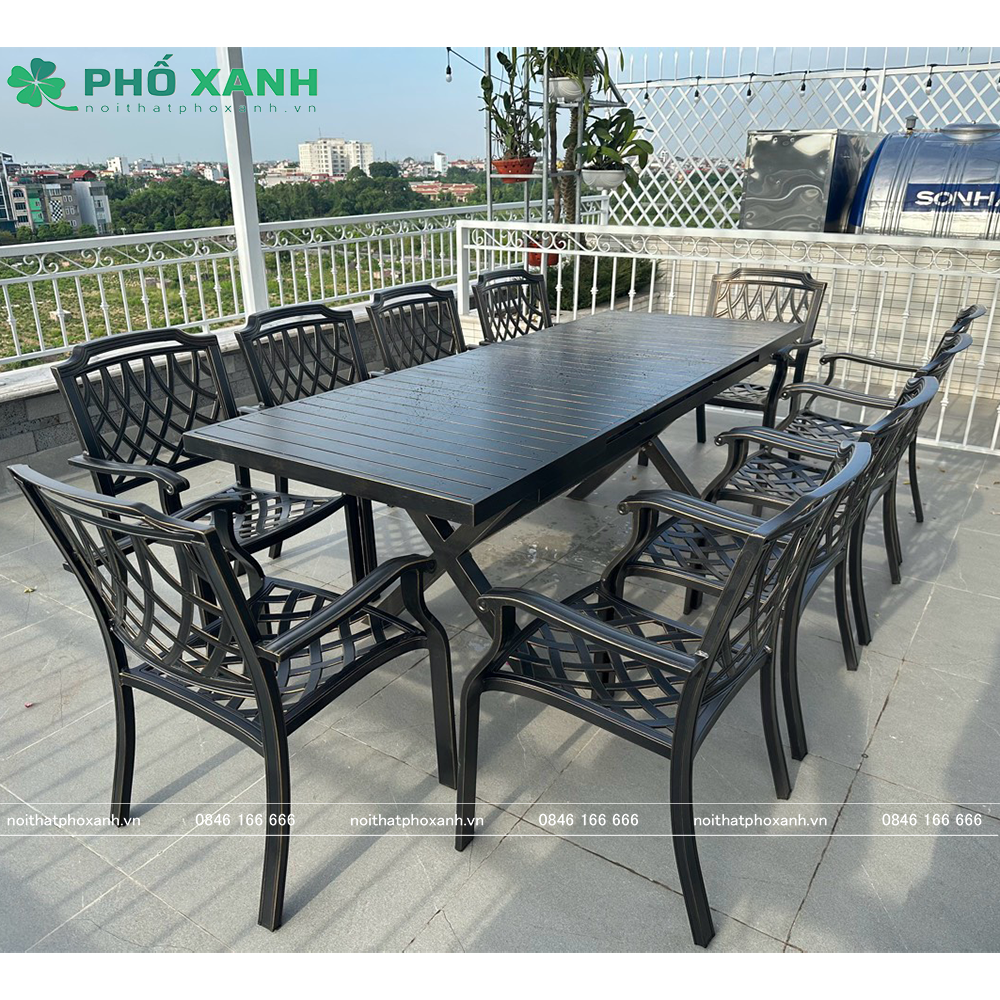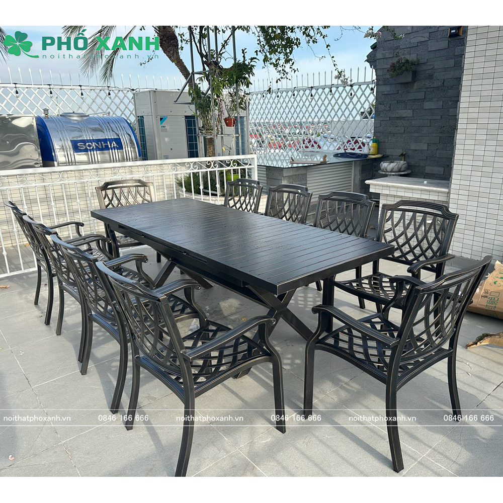 Bộ bàn ghế sân vườn BTG-18090NVD được thiết kế với kiểu dáng đơn giản nhưng tinh tế. Bộ sản phẩm gồm một bàn và tám ghế, có thể được kéo dài để phù hợp với không gian sân vườn và nhu cầu sử dụng của bạn. Chất liệu hợp kim nhôm đúc sẽ giúp sản phẩm có độ bền cao và chống được các tác động từ môi trường bên ngoài.