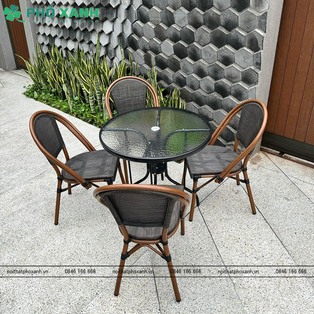 Chất liệu của bộ bàn ghế được sản xuất từ khung thép cho bàn và khung nhôm cho ghế, được sơn tĩnh điện để tăng tính bền và chống gỉ sét. Mặt ghế và mặt bàn được làm từ lưới Textilene chất lượng cao, giúp tạo sự thoải mái khi ngồi và dễ dàng vệ sinh.