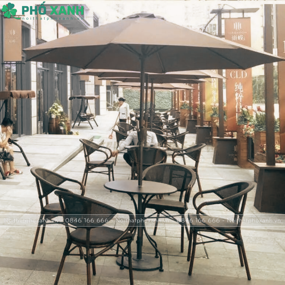 Kích thước D80*75 cm của bàn và chiều cao lý tưởng giúp người sử dụng cảm thấy thoải mái khi ngồi và thưởng thức không gian xung quanh. Quy cách 1 bàn 4 ghế phù hợp với quy mô quán cà phê sân vườn trung bình, tạo điểm nhấn hấp dẫn và thu hút khách hàng.