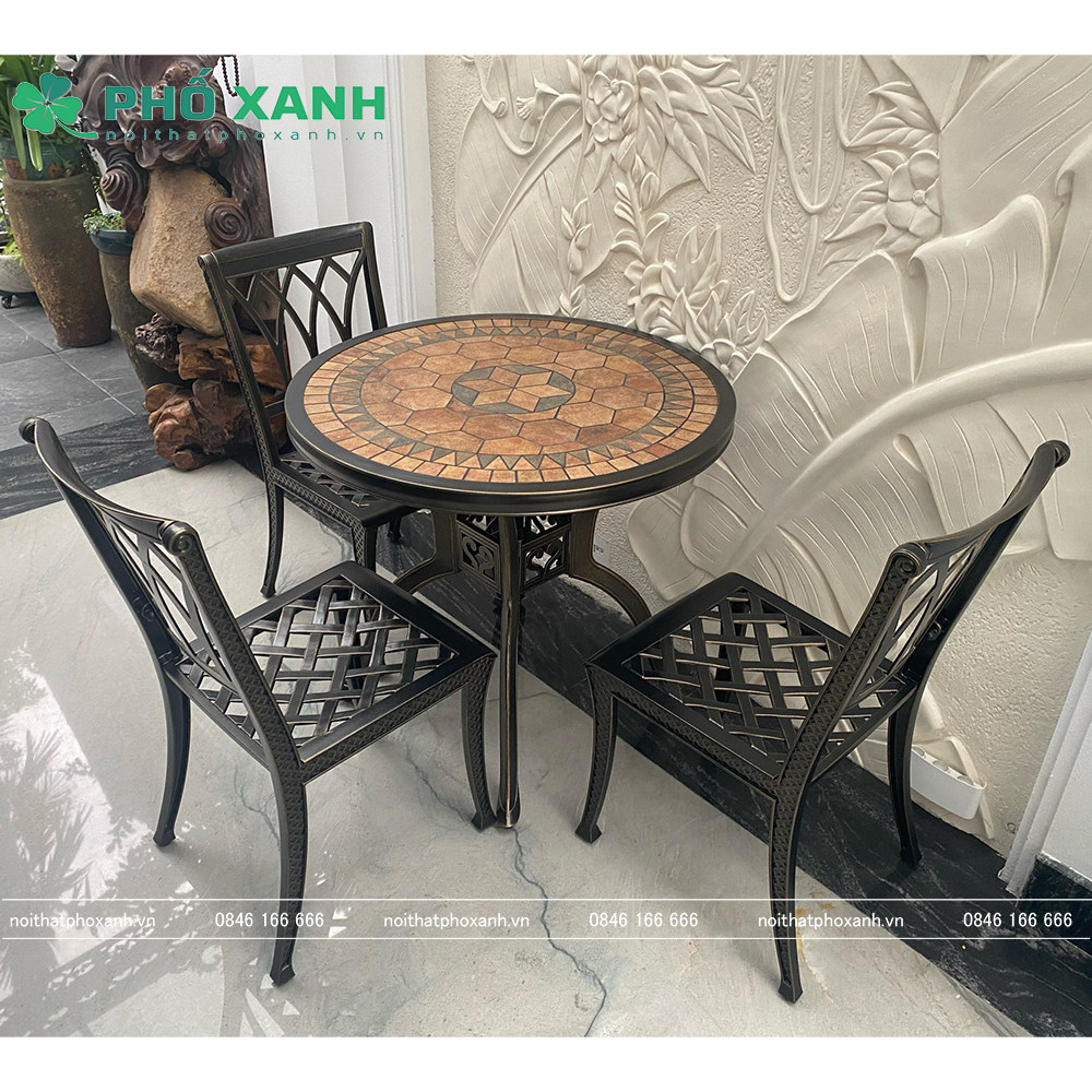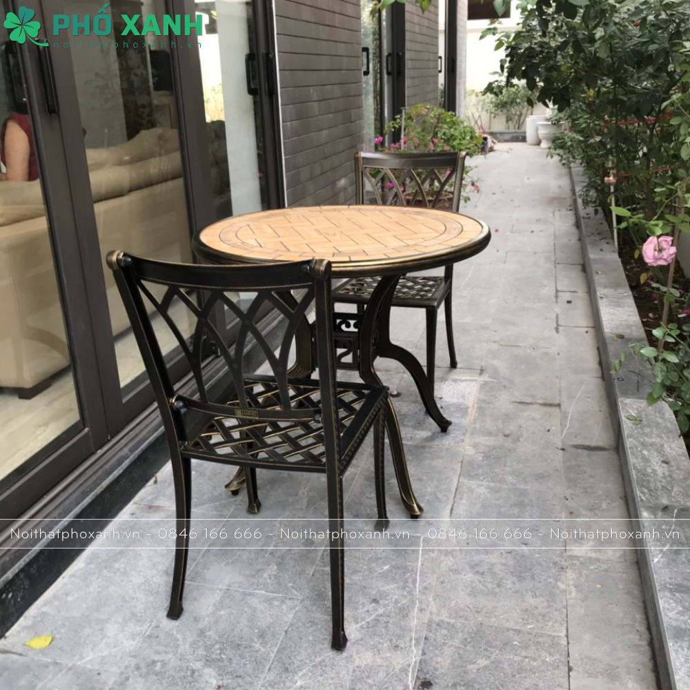 Bộ bàn ghế này được làm từ hợp kim nhôm đúc, với đặc tính nhẹ nhàng, bền bỉ và chịu được mọi điều kiện thời tiết. Mặt đá tự nhiên được chọn lựa kỹ càng, tạo nên sự sang trọng và độc đáo cho sản phẩm. Đồng thời, mặt đá còn mang lại tính năng chống trầy xước và dễ dàng vệ sinh.
