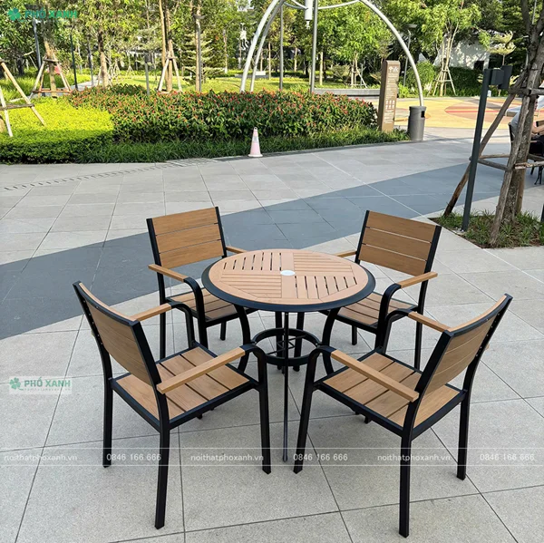Polywood là chất liệu giả gỗ cao cấp, vừa giữ được vẻ đẹp tự nhiên của gỗ, vừa khắc phục được nhược điểm dễ cong vênh, mối mọt. Bàn tròn ngoài trời 4 ghế làm từ Polywood mang lại cảm giác ấm cúng, hiện đại, rất phù hợp với ban công, sân thượng hoặc các khu nghỉ dưỡng cao cấp.