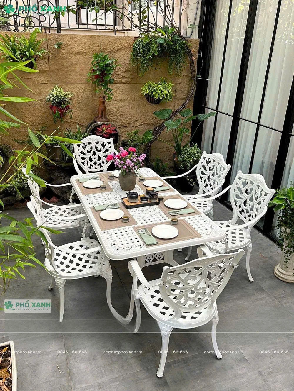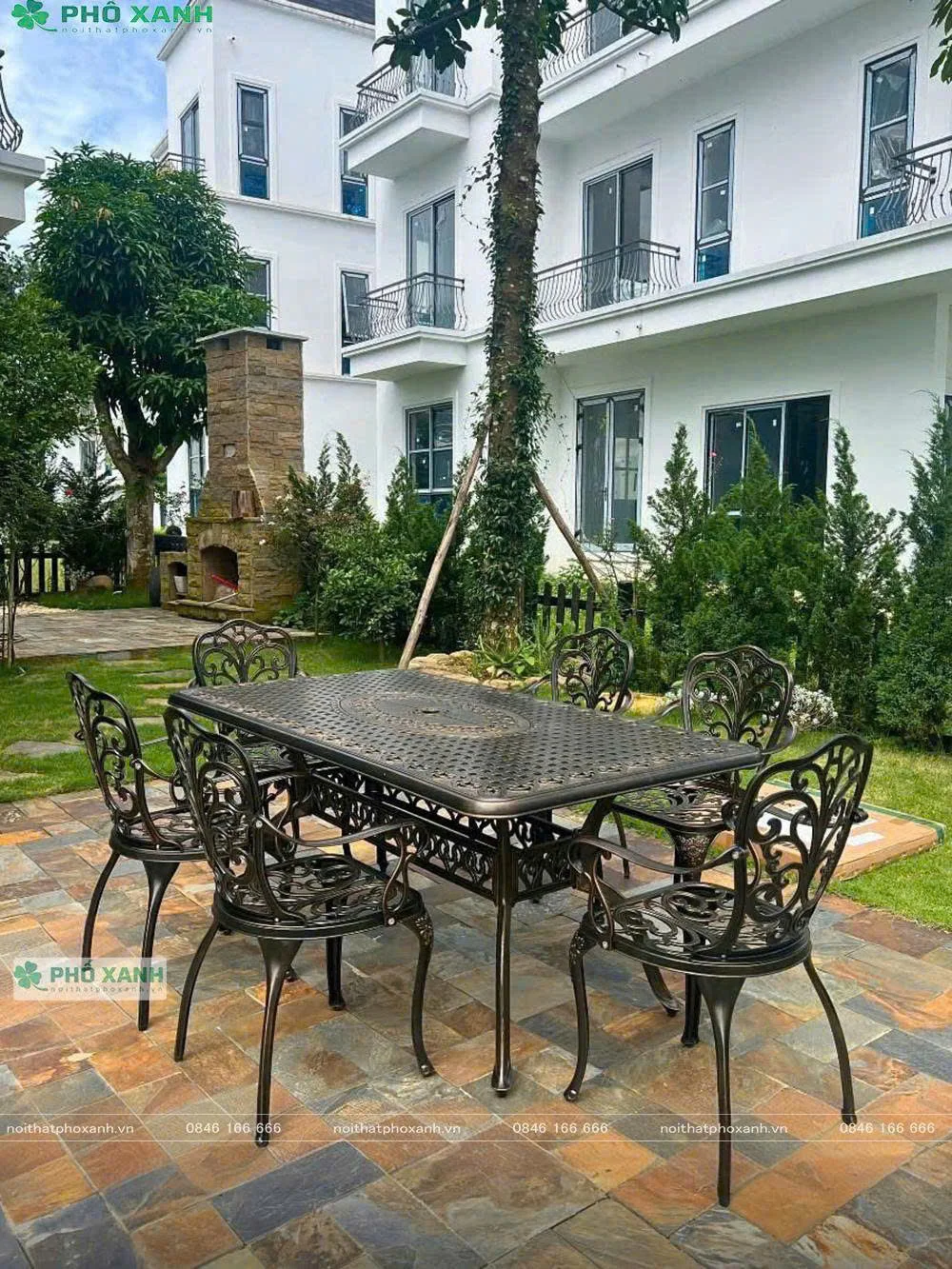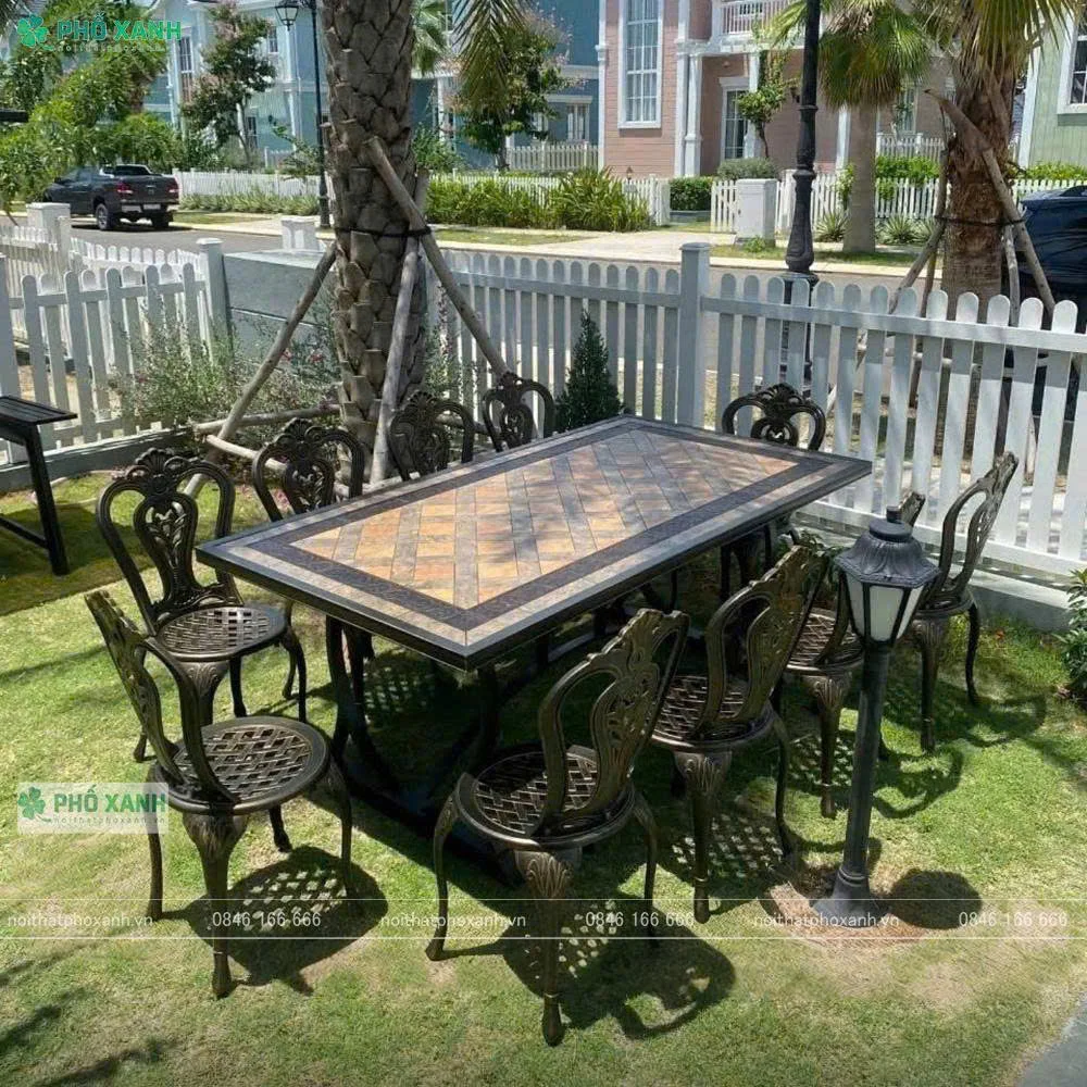 Khung bàn ghế sân vườn Phố Xanh thường được làm từ các chất liệu như nhôm đúc, sắt sơn tĩnh điện hoặc gỗ ngoài trời, mang lại sự chắc chắn và ổn định khi sử dụng.